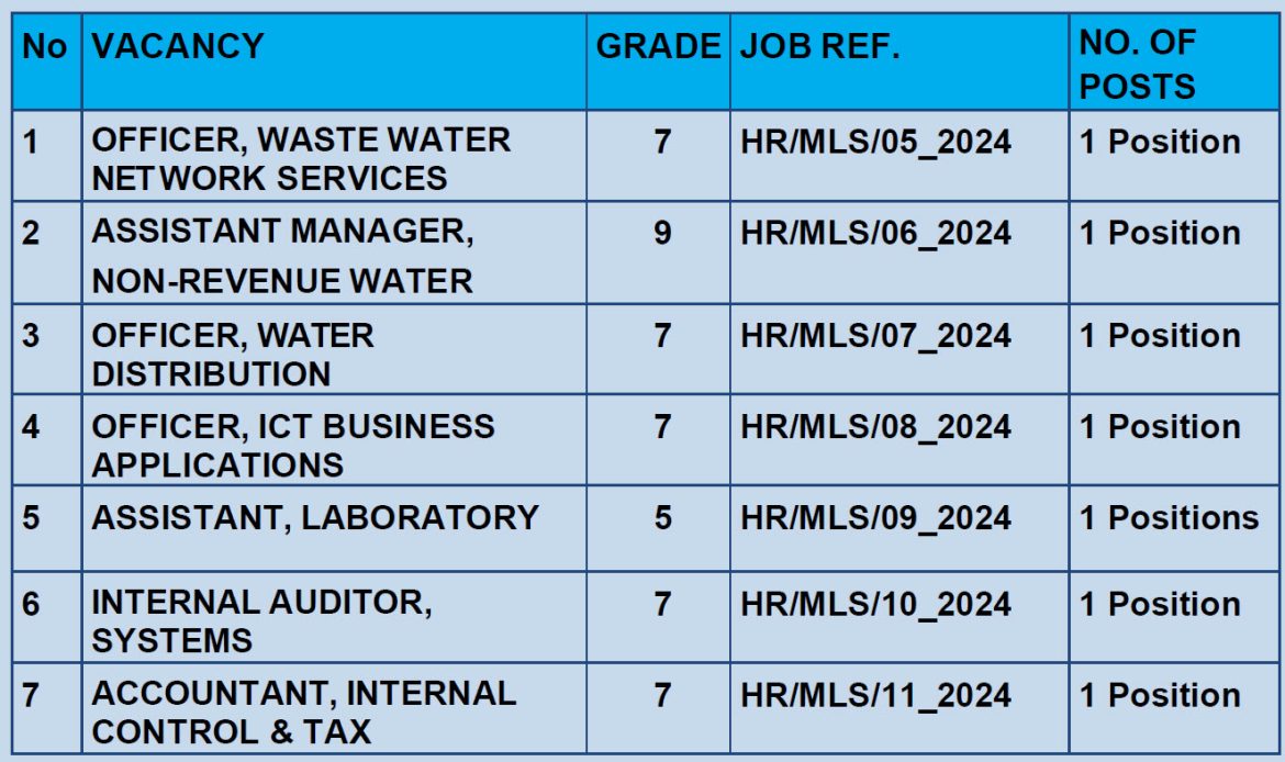 | ASSISTANT MANAGER, NON-REVENUE WATER | Ref No. HR/MLS/06-2024Job Grade: 9 Job Purpose:The incumbent will oversee Non-Revenue Water (NRW) management, including … | October 18, 2024 | View | |